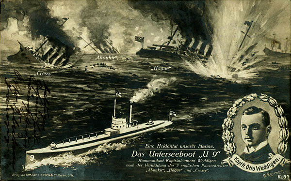 “The action of 22 September 1914 was a naval engagement that took place during the First World War, in which three obsolete British Royal Navy cruisers, manned mainly by reservists and sometimes referred to as the "livebait squadron", were sunk by one German submarine while on patrol. Approximately 1,450 sailors were killed, and there was a public outcry at the losses. The incident eroded confidence in the British government and damaged the reputation of the Royal Navy at a time when many countries were still considering which side in the war they might support.”