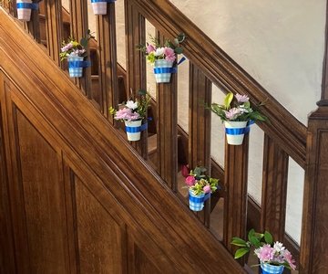 did this with the paper cups of flowers tied on the banisters this