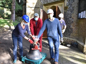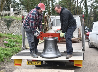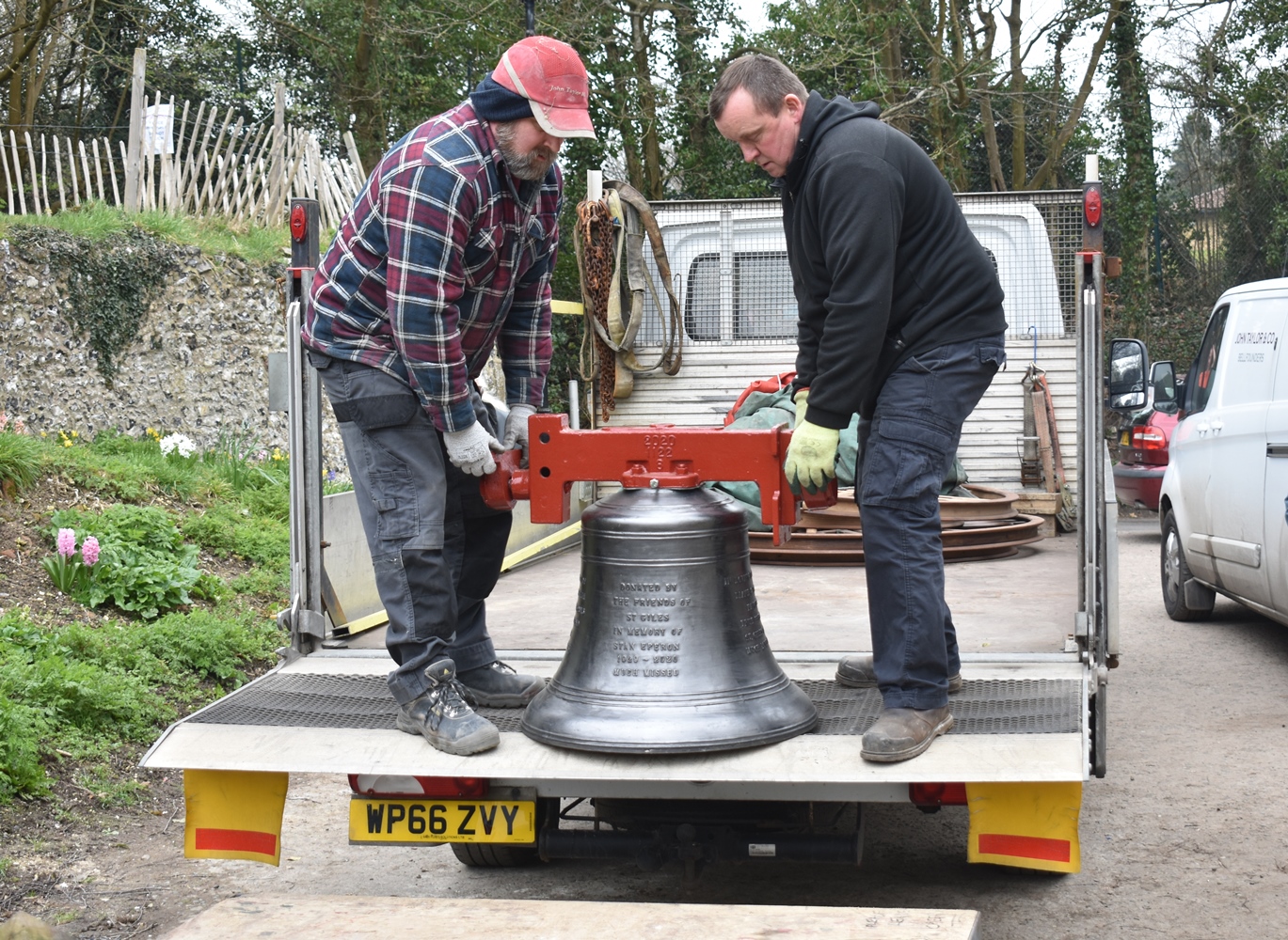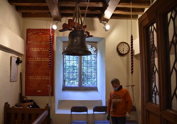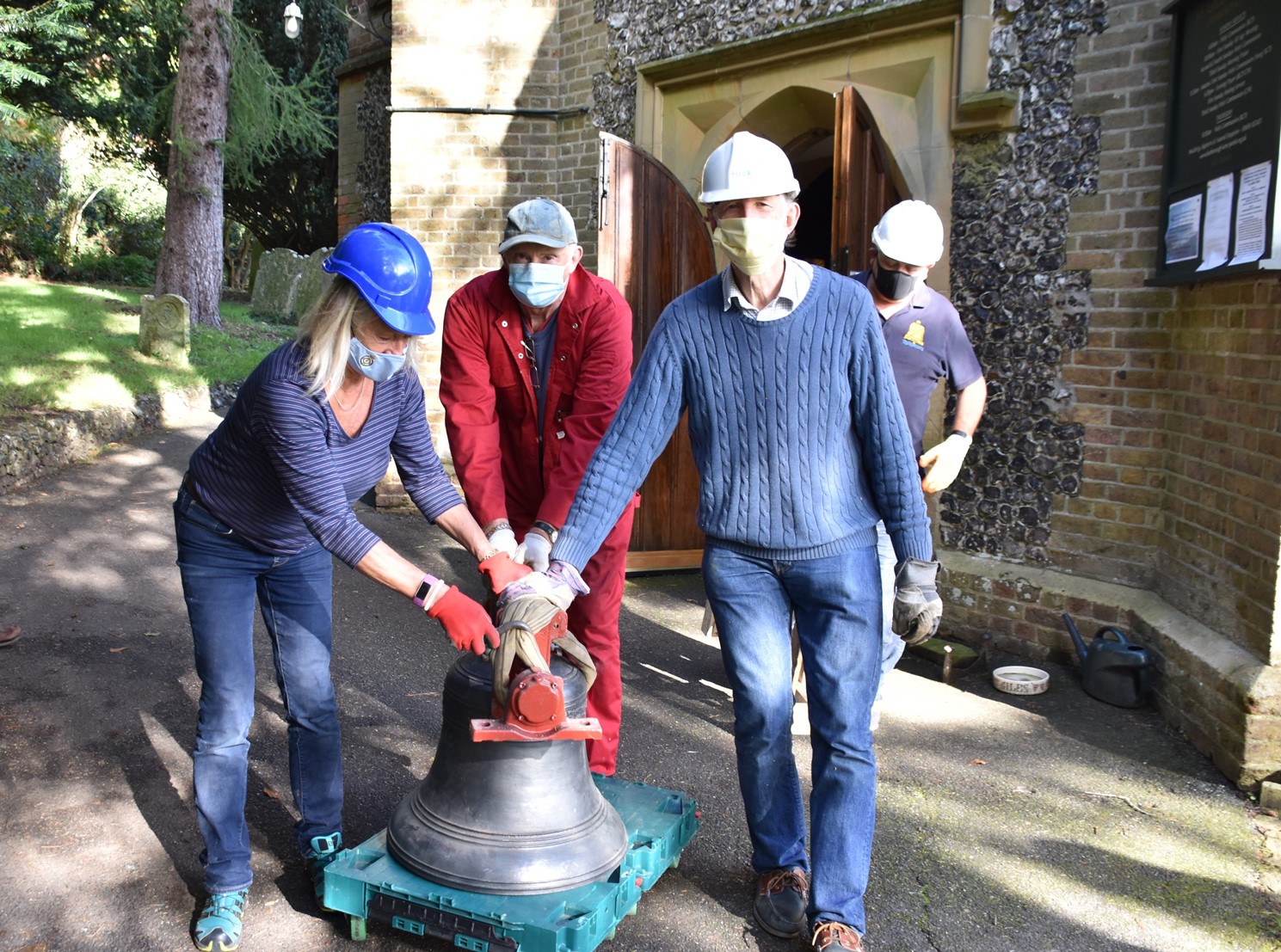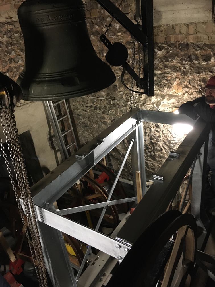 Below is an account, with photos, from both October 2020 when the existing fourth bell was removed and taken away for retuning, and (further down the page) the week in March 2021 when this bell together with the two new bells were delivered to St. Giles and installed in the tower.