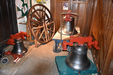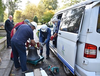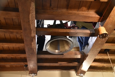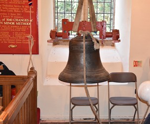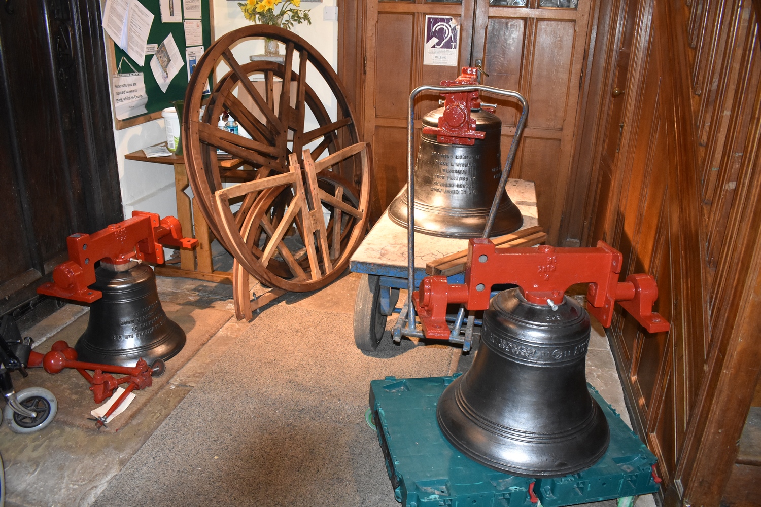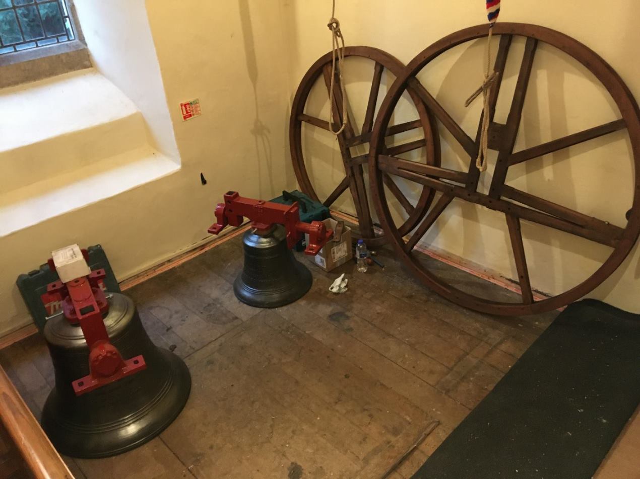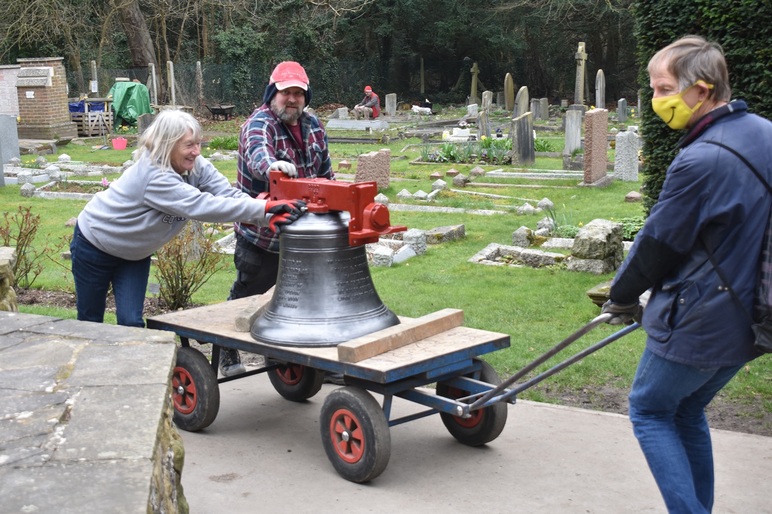 Below is an account, with photos, from both October 2020 when the existing fourth bell was removed and taken away for retuning, and (further down the page) the week in March 2021 when this bell together with the two new bells were delivered to St. Giles and installed in the tower.
