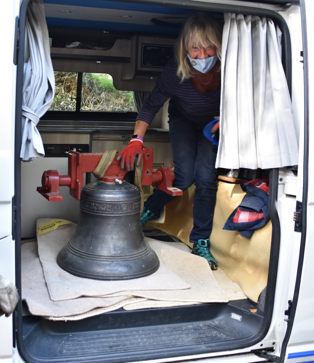 Once carefully lowered the bell was placed on a trolley to then be pushed to the camper van in which it was to be transported to Loughborough three days later. Some muscle power was needed to get the bell inside the van and accompanying it were its wheel and clapper as the bell foundry said they also needed these so they could test ring it once retuned.