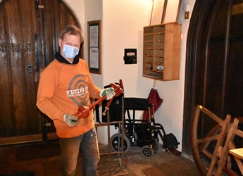 Before the bell could be lowered down the tower certain enabling works had to be carried out. This included carefully prising up the skirting trim in the ringing chamber so freeing the carpet and underlay and enabling these to be lifted. This then allows access to the