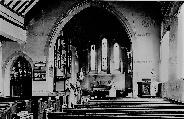 The most interesting interior feature, now lost, was the East Window which before restoration seems to have been quite unusual. The surviving window was a large rectangular opening placed in the East wall, which was then subdivided into three lights each with a round head. This window was probably constructed during the rebuilding of 1641. The old photographs also show the survival of two capitals situated at the upper external corners of the window. On closer inspection these can be seen to be mutilated foliage capitals possibly of the 13th century. If this were the case, they would be from the 13th century window.