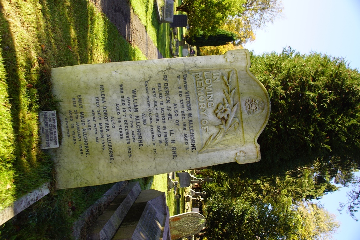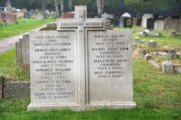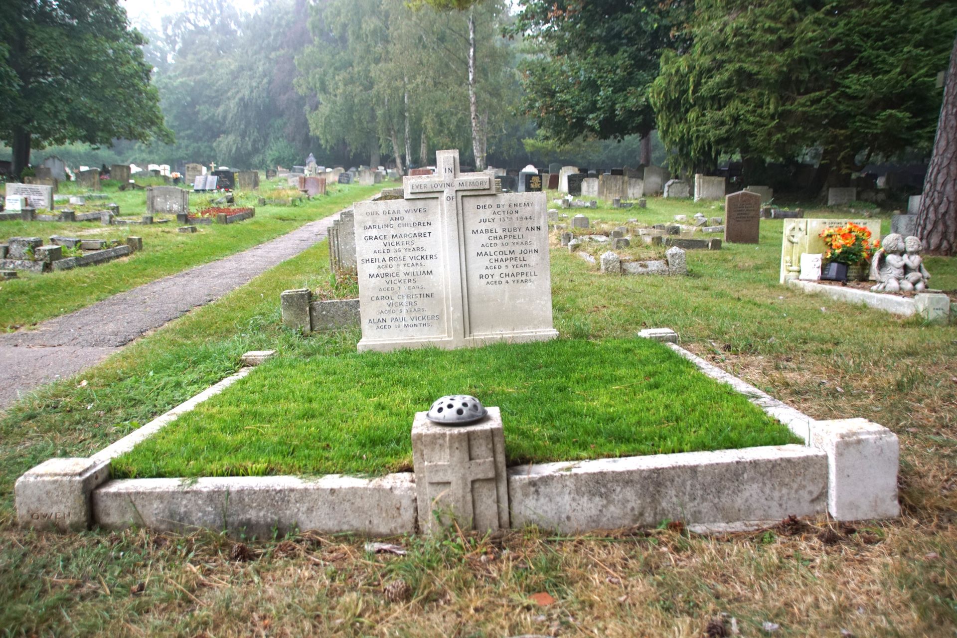 The grave concerned is a large square plot with a headstone inscribed “IN EVER LOVING MEMORY OF OUR DEAR WIVES AND DARLING CHILDREN. Died by enemy action July 13th, 1944”. Eight names are listed: - Grace Margaret Vickers (35) and her children Sheila (9) Maurice (7) Carol (5) and Alan (18 months). Mabel Ruby Ann Chappell (30) and her children Malcolm (5) and Roy (4)