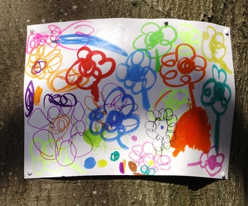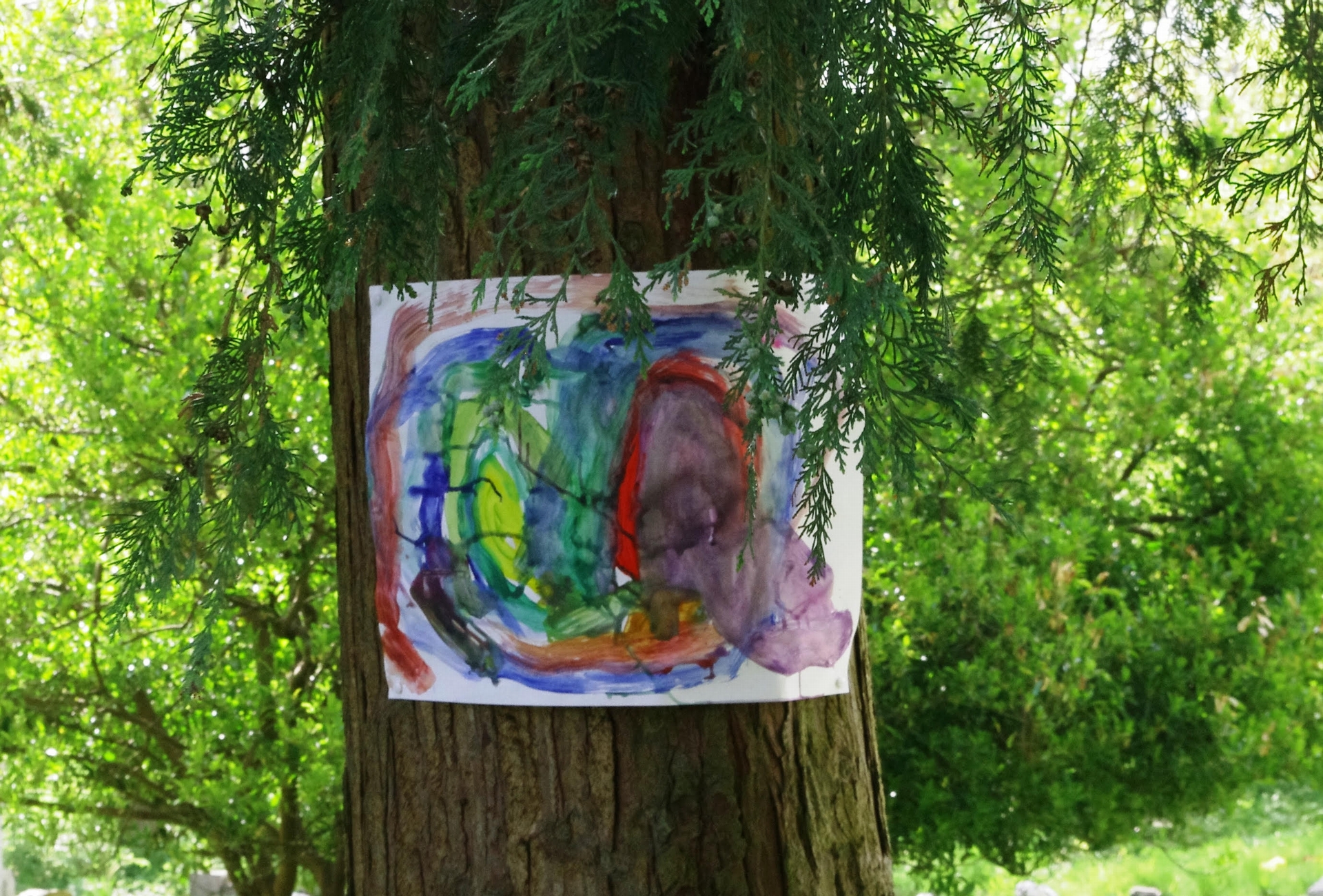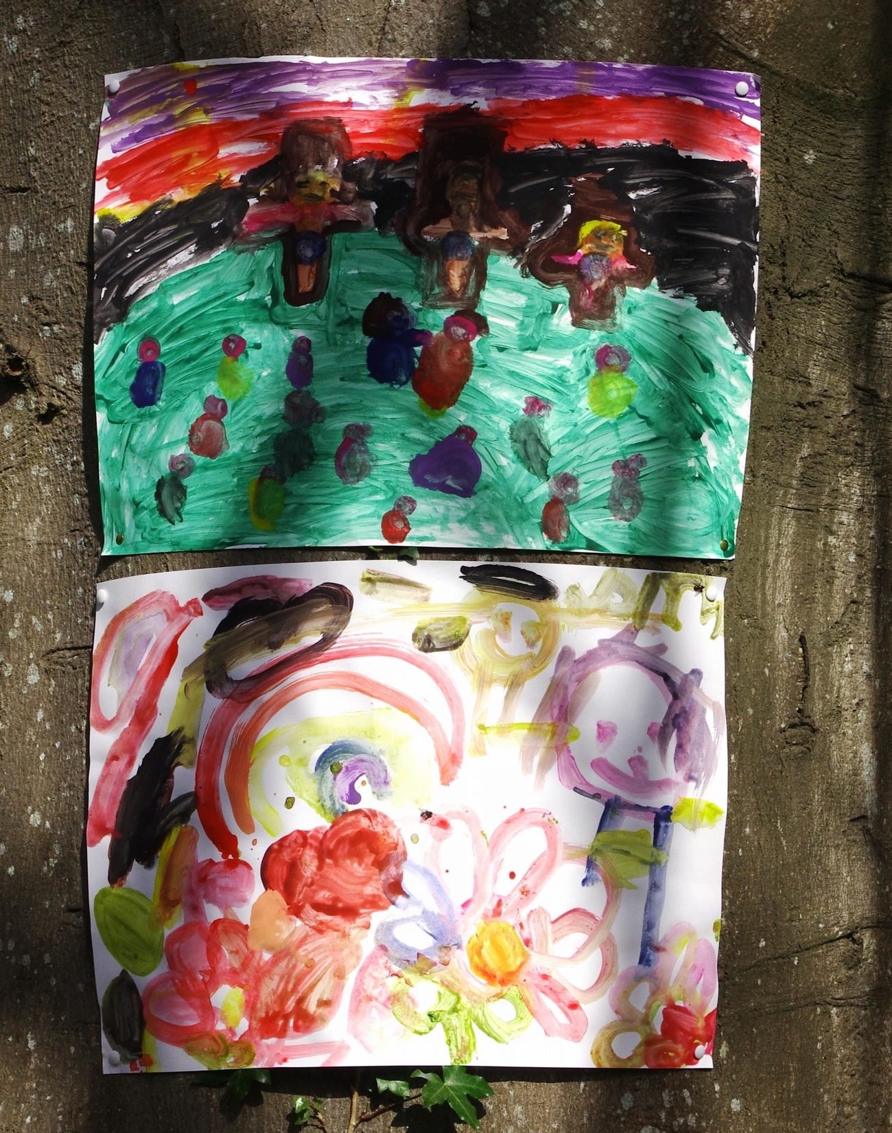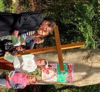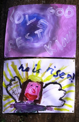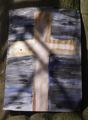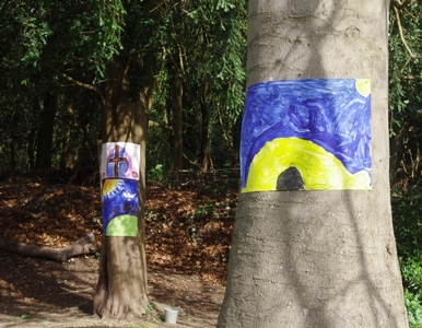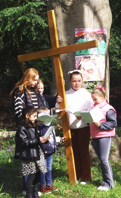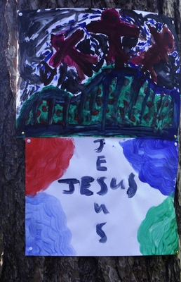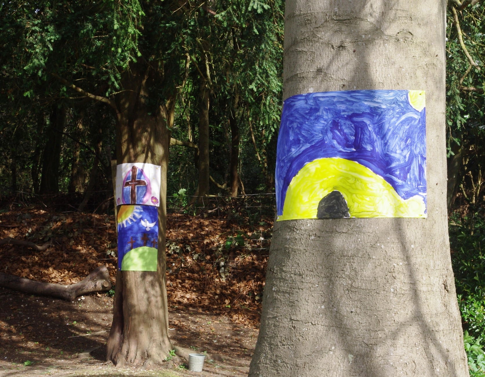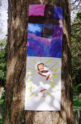 The children made posters for the Good Friday family service. These were attached to trees in the churchyard.