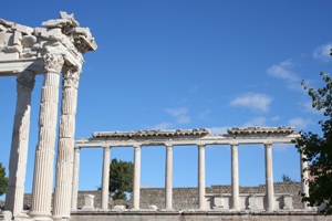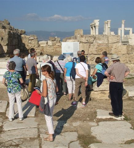 We begin today by driving to Sart, the site of ancient Sardis, where one of the most impressive features is the Roman gymnasium and baths complex which has undergone major reconstruction. Adjacent to this complex is the reconstructed remains of a huge synagogue with colourful floor mosaics and a row of shops with their various trades identified by archaeological finds. Also here is the vast (329ft by 165ft) Temple of Artemis, it consist of a huge foundation with 15 massive Ionic columns.