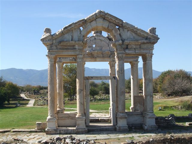 After lunch we took a tractor and trailer ride to visit the huge site of the Roman city of Aphrodisias. The ruins were hidden by the village of Geyre until an earthquake struck in 1956, when the villagers were relocated a short distance to the west and excavations could begin. What was revealed was an entire ancient city on a par with Ephesus. It includes a 1st century theatre, and the Sebasteion, a complex of twin porticos and central paved area, probably built originally as a shrine to the goddess, Aphrodite. Also the Temple of Aphrodite, the fully restored Tetrapylon and probably the finest structure of the site, a 30,000 seat stadium, which is claimed to be the best preserved in the Anatolia region. We finished the day by checking into the last hotel (4 night stay) in Pamucak.
